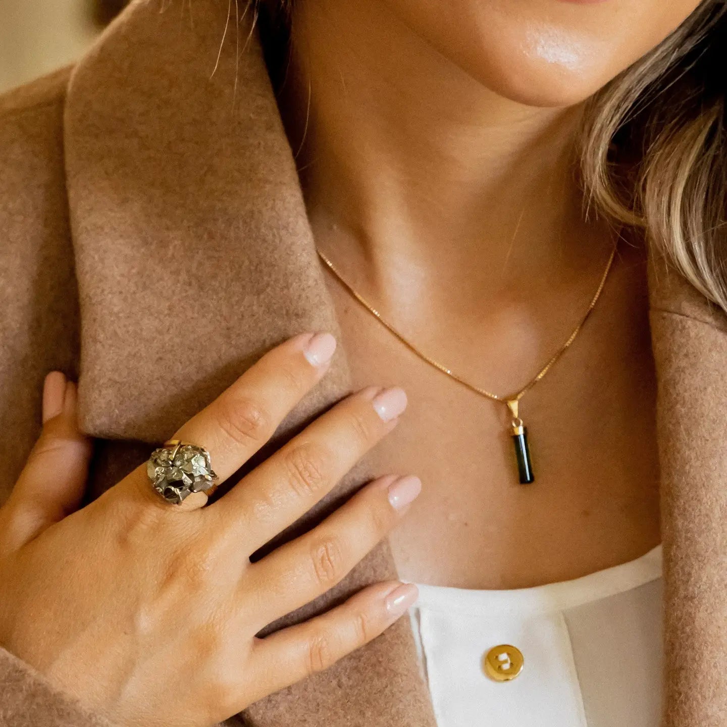 Einer unserer Bestseller, der verstellbare große Raw Pyrite Ring. Dieser Ring ist das Accessoire, das Sie benötigen. Es verleiht jedem Ihrer Looks Luxus mit einer sehr raffinierten Note. Pyrit ist ein Muss, denn es ist das ultimative Symbol für Reichtum und Glück. Nicht alles, was glänzt, ist Gold, aber dieser glamouröse Stein ist genauso gut.