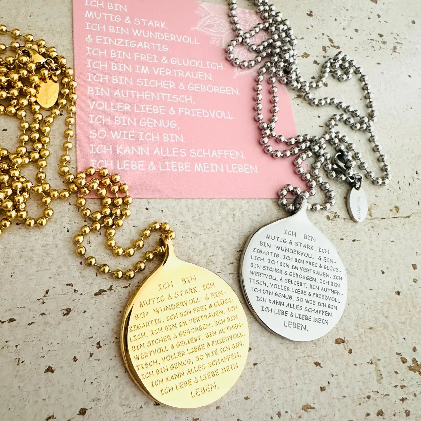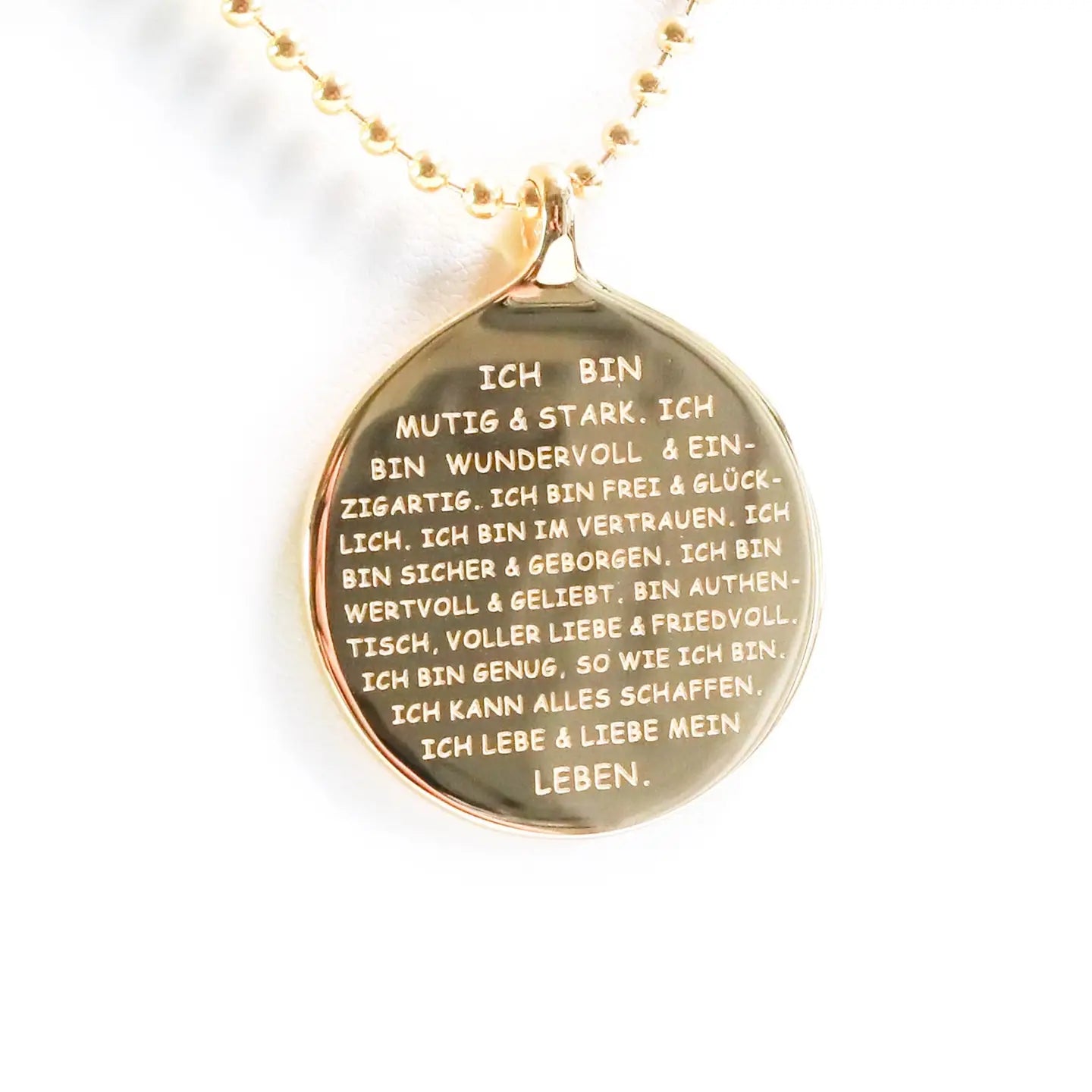 "ICH BIN" Anhänger mit verschiedenen Edelstahlketten Tragen Sie eine kraftvolle Botschaft mit unserem Anhänger "ICH BIN". Dieser besondere Schmuckstück erinnert Sie an Ihre innere Stärke und Einzigartigkeit – von "ICH BIN MUTIG & STARK" bis "ICH LEBE & LIEBE MEIN LEBEN". Die positive Affirmation ist eine ständige Erinnerung daran, dass Sie genug sind, so wie Sie sind. Produktdetails: Botschaften: ICH BIN MUTIG & STARK, ICH BIN WUNDERVOLL & EINZIGARTIG, ICH BIN FREI & GLÜCKLICH, ICH BIN IM VERTRAUEN, ICH BIN SICHER & GEBORGEN, ICH BIN AUTHENTISCH, VOLLER LIEBE & FRIEDVOLL, ICH KANN ALLES SCHAFFEN. Kette: Hochwertige Kugelkette aus Edelstahl, wählbar in verschiedenen Längen und Stärken Material: Edelstahl (silber oder in hochwertiger Vergoldung) Eigenschaften: Hypoallergen, wasserfest, langlebig und nachhaltig Jeder Anhänger wird in einer eleganten Schmuckschachtel geliefert – ideal als Geschenk oder für sich selbst.